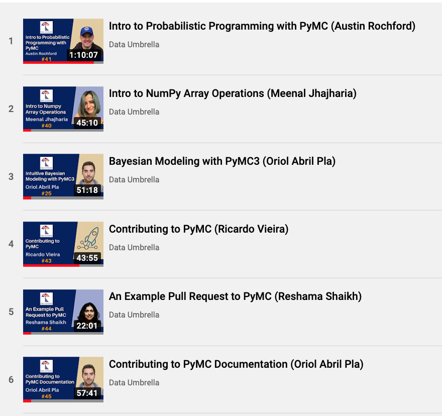 Data Umbrella and PyMC organized their first collaborative sprint in February 2022. The sprint event was preceded by a series of webinars and videos by PyMC library team members in January and February 2022:
